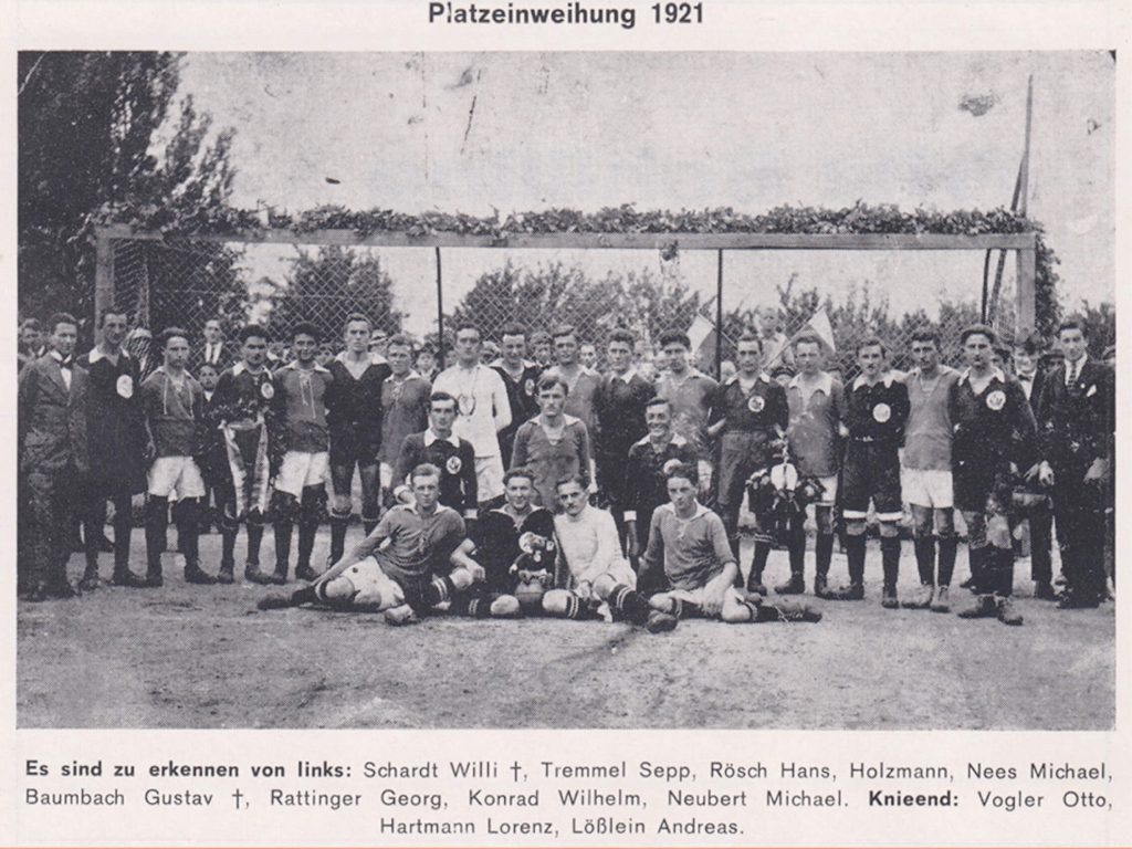 Die Beschaffung des Sportplatzes war nun gleich das schwierigste Problem der jungen Fußballer. Der damalige Gemeinderat lehnte es ab, Wiesenteile für die Errichtung eines Sportplatzes abzutreten. Erst nach langem Ringen des Sportleiters Lößlein, welcher selbst beim Gemeinderat vorstellig wurde, konnte das schwierigste aller Probleme gelöst werden. Durch den Einsatz aller Mitglieder konnte der Sportplatz gerichtet werden und am 02.09.1921 fand die Einweihung mit einem Spiel gegen Franken Kitzingen statt.